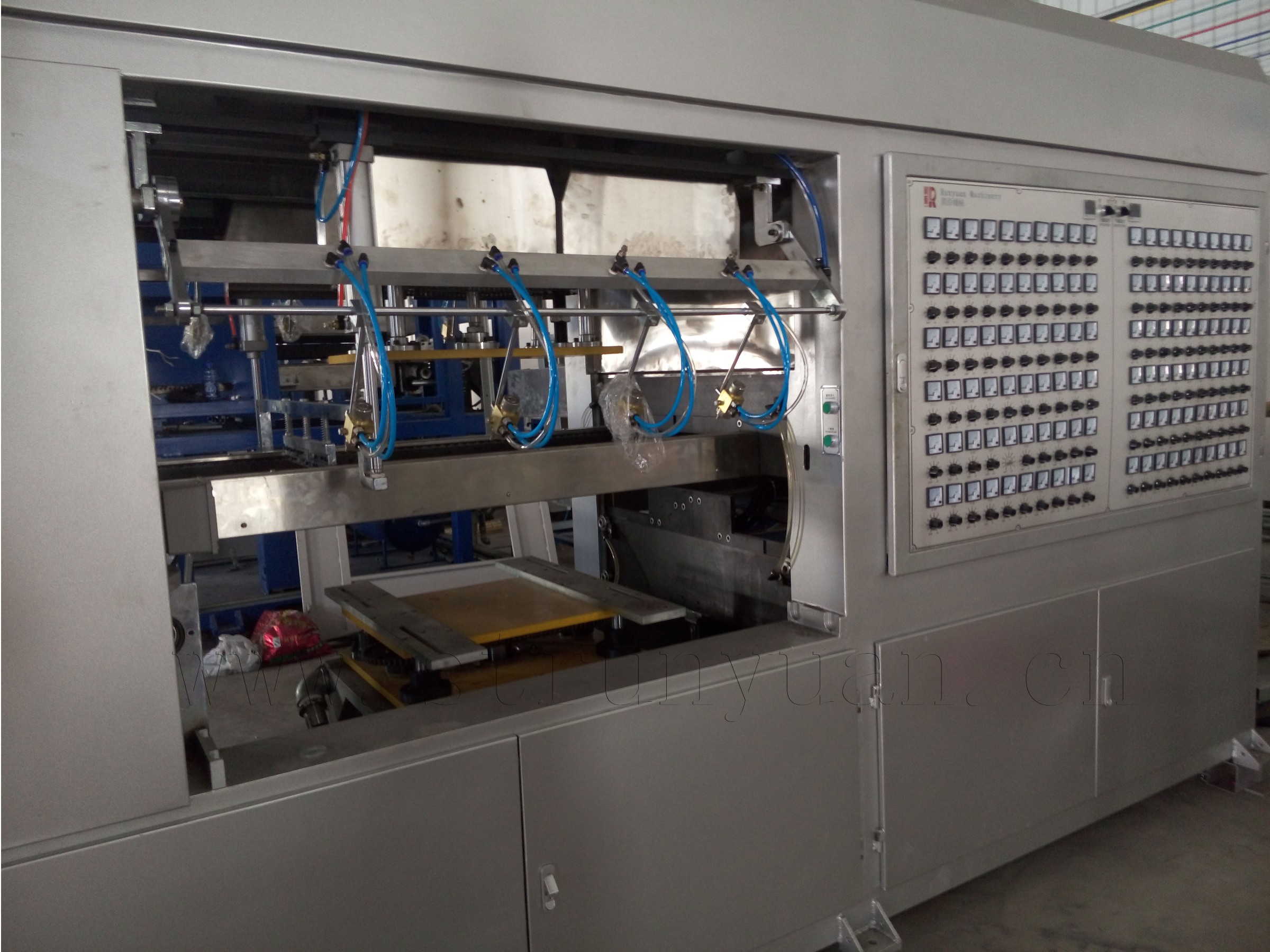 本機與氣動、機械、傳動相結(jié)合,實現(xiàn)送片材、成型、脫模、切料、堆垛等自動連續(xù)工作。采用PLC控制系統(tǒng),使機器工作更可靠